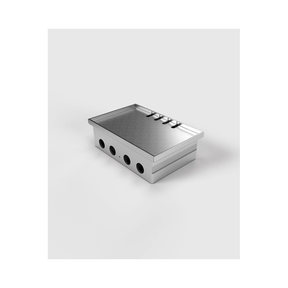 Bodensteckdose 8804T aus Aluminium mit Deckel zum Auflegen. Der Deckel schließt auch bei gesteckten Standardsteckern in gerader oder abgewinkelter Form. Ideal für Teppichböden! Das Gehäuse und der Geräteträger bestehen aus massivem Aluminium, der Deckel aus 1,5 mm Edelstahl (1.4301). Eigene Beläge sind im Deckel integrierbar. Weitere Bestückungsvarianten auf Anfrage.