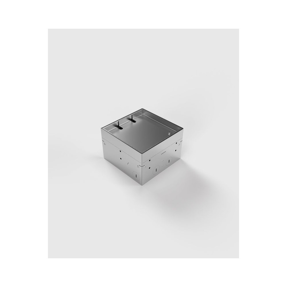 Höhenverstellbarer Bodentank 8902B mit 2 Steckplätzen. Die Aufnahmebox, der Rahmen und der Deckel bestehen aus Edelstahl. In den herausnehmbaren Klappdeckel können Bodenbeläge wie Teppich, Parkett, Laminat etc. mit einer Stärke von 15 mm eingesetzt werden. Der Deckel schließt auch bei gesteckten Standardsteckern in gerader oder abgewinkelter Form. Der Kabelauslass besteht aus einem doppelten halbrunden Ausschnitt am Rand des Deckels. Weitere Bestückungsvarianten auf Anfrage.