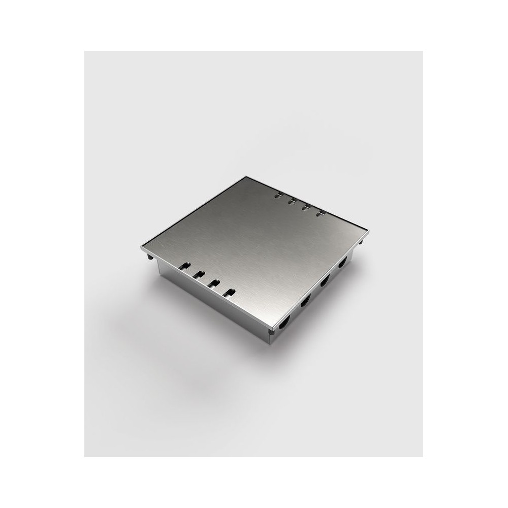 Bodentank 8808E aus Edelstahl. Innen befinden sich zwei Geräteträger aus Aluminium für je 4 Einheiten. Der Einbau kann an einer beliebigen Stellen im Fußboden erfolgen, da für die Leitungszuführung Rohrleitungen verwendet werden. Diese Ausführung ist wegen der geringen Höhe besonders gut für Fußböden im Altbaubereich geeignet. Der Deckel aus Edelstahl, Oberfläche geschliffen, schließt auch bei gesteckten Steckern. Weitere Bestückungsvarianten auf Anfrage.