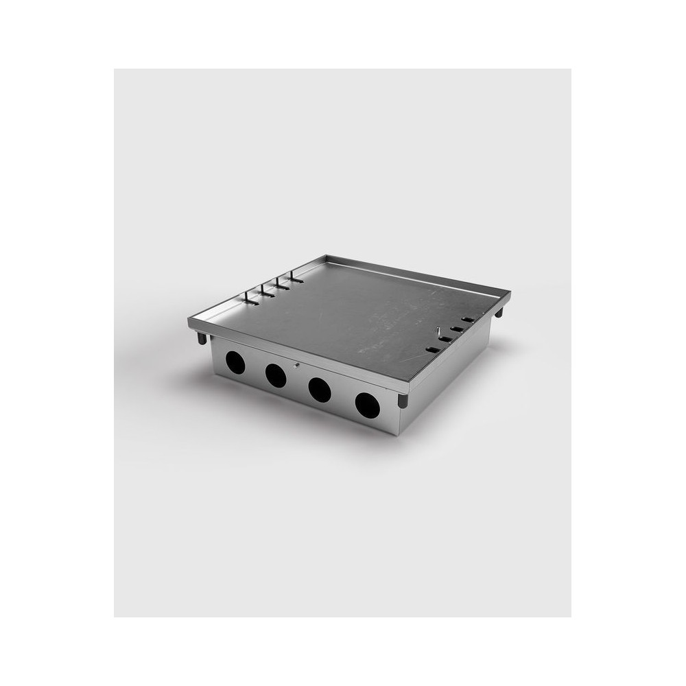 Bodentank 8808T aus Edelstahl. Innen befinden sich zwei Geräteträger aus Aluminium für je 4 Einheiten. Der Einbau kann an einer beliebigen Stellen im Fußboden erfolgen, da für die Leitungszuführung Rohrleitungen verwendet werden. Diese Ausführung ist wegen der geringen Höhe besonders gut für Fußböden im Altbaubereich geeignet. Der Deckel ist für die Einlage von Teppich-, Korkböden o. ä., mit einer Belagstärke von 5–7 mm konzipiert, und schließt auch bei gesteckten Steckern. Weitere Bestückungsvarianten auf Anfrage.