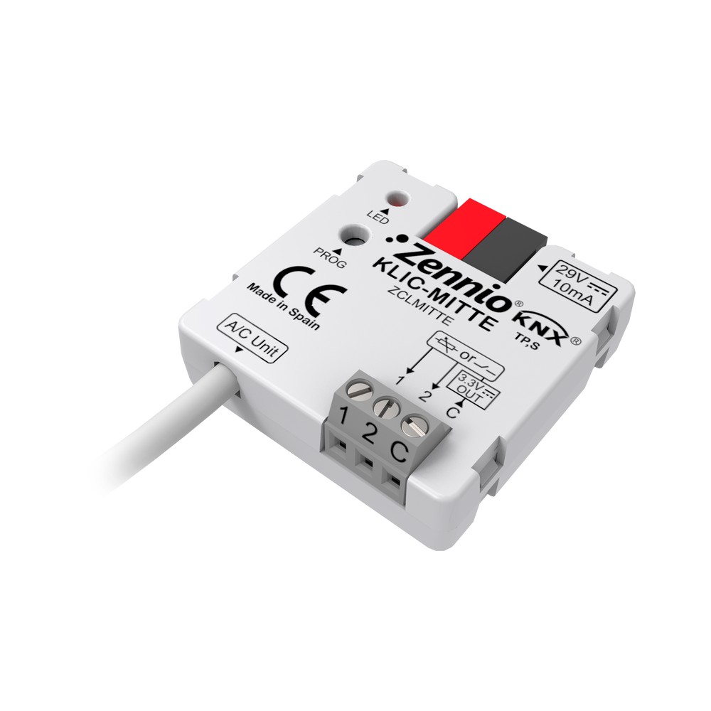 KNX-Interface für Mitsubishi-Electric Ecodan Klimageräte via IT-Verbindung. REG Gerät, 2 TE. KLIC-MITTE ist eine bidirektionale Kommunikationsschnittstelle für die KNX-Integration von Klimageräten des Herstellers Mitsubishi-Electric. Das Gerät verfügt über 2 analog/digitale Eingänge für Temperaturfühler, Bewegungsmelder oder potenzialfreie Schalter/Taster/Sensoren und ein Logikmodul mit 10 Funktionen.