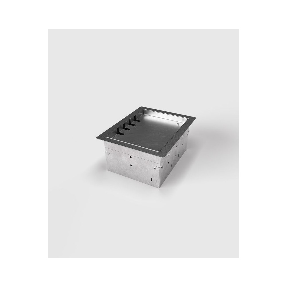 Hohlbodentank 8504B mit 4 Steckplätzen. Die Aufnahmebox besteht aus sendzimirverzinktem Stahlblech. Rahmen und Deckel aus Edelstahl. Der Deckel verfügt über einen Kabelauslass und schließt auch bei gesteckten Standardsteckern in gerader oder abgewinkelter Form. Der herausnehmbare Deckel kann mit 15 mm Teppich, Parkett, Vinyl, Laminat etc. belegt werden. Weitere Bestückungsvarianten auf Anfrage.