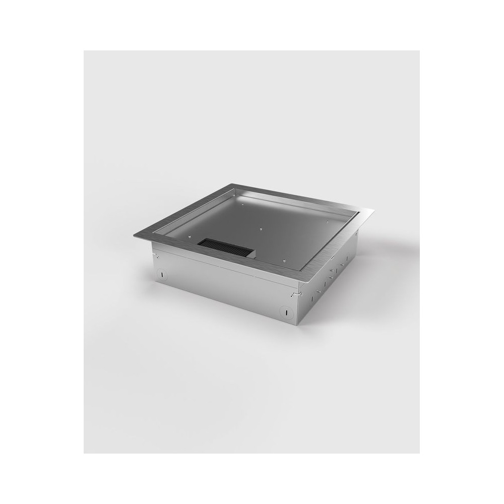 Hohlbodentank 8512B, 12-fach bestückt. Die Aufnahmebox besteht aus sendzimirverzinktem Stahlblech und der Geräteträger aus Aluminium. Der Rahmen (2 mm) und der Deckel (1,5 mm) bestehen aus Edelstahl (1.4301). Der Deckel schließt auch bei gesteckten Standardsteckern in gerader oder abgewinkelter Form. In den herausnehmbaren Deckel können diverse Bodenbeläge (15 mm hoch) eingelegt werden. Weitere Bestückungsvarianten auf Anfrage.