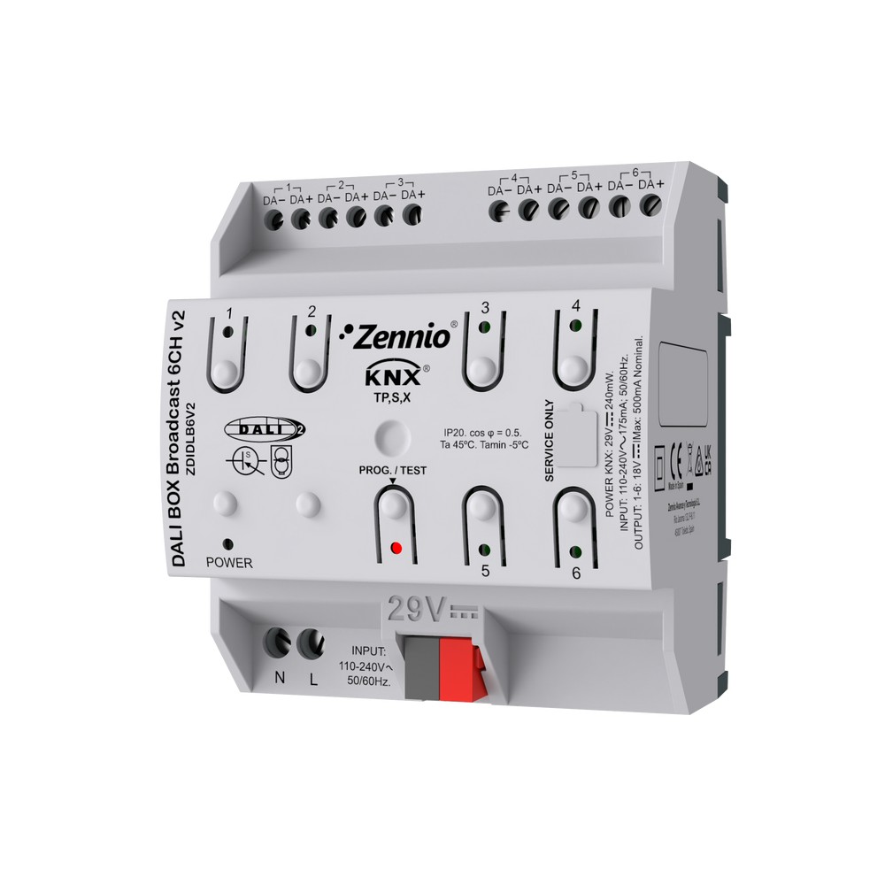 KNX-DALI Broadcast Interface für Hutschienenmontage (4,5 Einheiten). Es verfügt über 6 Kanäle, die über Broadcast-Befehle gesteuert werden, einschließlich Farbvorschaltgeräten (DT8). Es können insgesamt bis zu 250 DALI Vorschaltgeräte pro Interface angeschlossen werden und es können bis zu 64 Vorschaltgeräte pro Kanal verknüpft werden. Darüber hinaus können bis zu 20 Szenen/Sequenzen pro Kanal konfiguriert werden. Das Gerät ist kompatibel mit KNX Secure. Es ermöglicht eine manuelle Steuerung und verfügt über LED-Statusanzeigen für jeden Kanal.