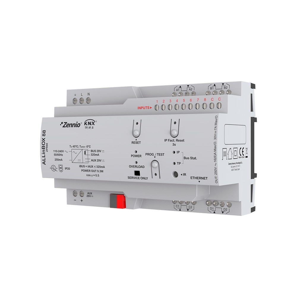 Der Zennio ZPR88 ist ein Multifunktionsaktor. Dieser alles in ein Aktor hat 8 Eingang und 8 Ausgänge. Der Multifunktionsaktor beinhaltet eine KNX-Spannungsversorgung von 320mA.