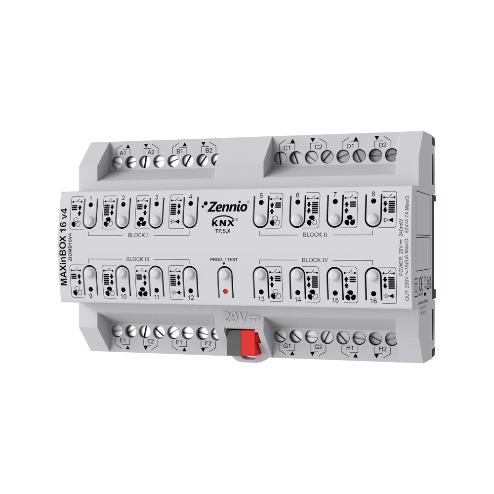 Der MAXinBOX 16 v4 ist ein Multifunktionsaktor zur Montage als REG-Gerät, welcher die Konfiguration von bis zu 8 Jalousiekanälen, bis zu 16 individuellen Ausgängen oder als Blocks von je 4 Ausgängen zur 2-Rohr Fan-Coil Steuerung ermöglicht.