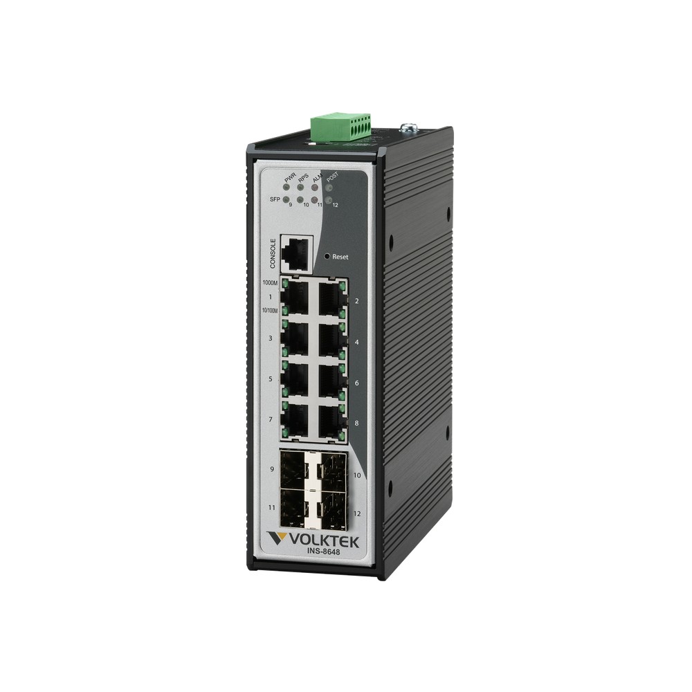 Volktek INS-8648 Managed Industrie-Switch verfügt über 8 Ports 10/100/1000Base-T und 4 Gigabit SFP-Steckplätze. Gehärtete und in einem robusten Gehäuse eingeschlossene Komponenten, extreme Temperaturbeständigkeit und hohe Vibrations- und Schockfestigkeit.