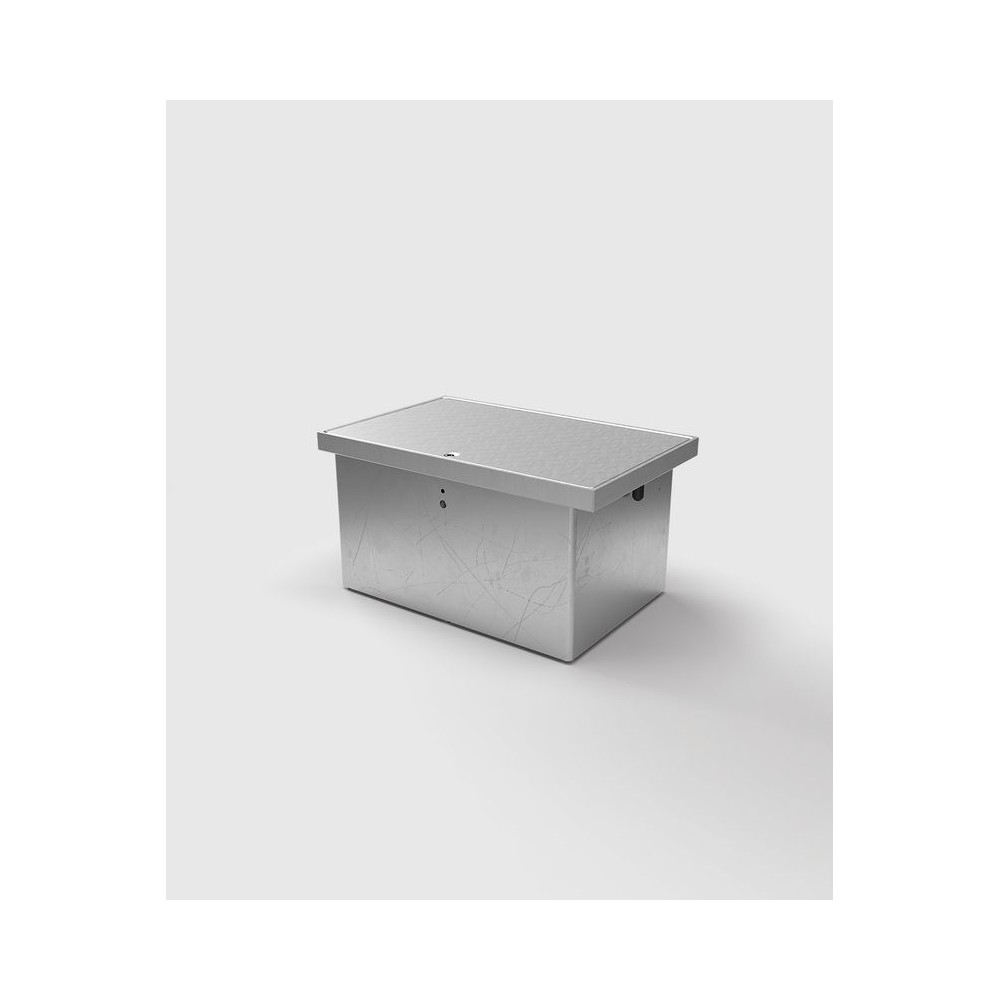 CEE floor tank 8314A made of solid aluminium with lockable hinged lid. Easy opening and closing of the lid by means of a snap lock integrated in the lid. When closed, the floor tank is splash-proof thanks to the lid seal and is therefore also suitable for wet sweepers. The frame and lid surfaces are anodised in natural aluminium. Other colours and equipment variants on request.