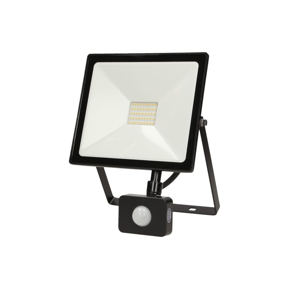 LED floodlight with motion detector. Thanks to the LED technology a high energy efficiency and long life time of the device is achieved. The LED floodlight is adjustable (up and down). The motion detector can be adjusted mechanically: vertically 300°, horizontally 120°.