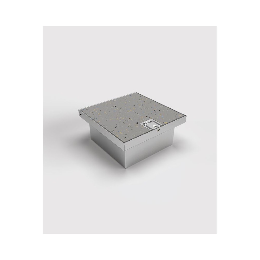 The complete floor tank 2003B is made of 1.5 mm thick V2A stainless steel. The hinged lid opens without tools and can be fitted with various floor coverings. When closed, the floor tank is watertight and thus suitable for cleaning with wet sweepers. The unit can contain up to 3 installation devices. The plug inserts have a VDE symbol. Other equipment variants are available on request.