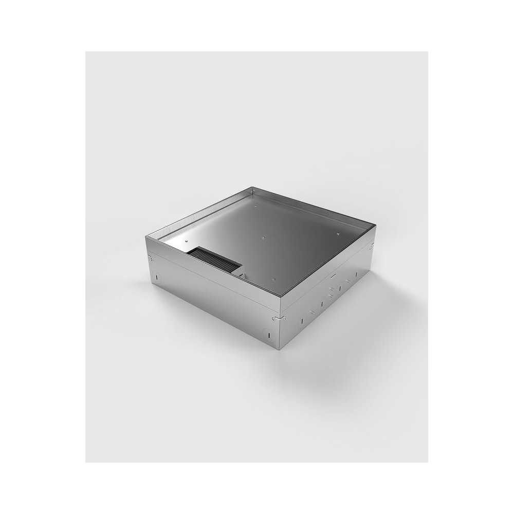 Height-adjustable floor tank 8912B with 12 slots. The receptacle box, frame and lid are made of stainless steel. Floor coverings such as carpet, parquet, laminate etc. with a thickness of 15 mm can be inserted into the removable lid. The lid has a cable outlet and closes even when standard plugs are inserted in straight or angled form. Other fitting variants are available on request.