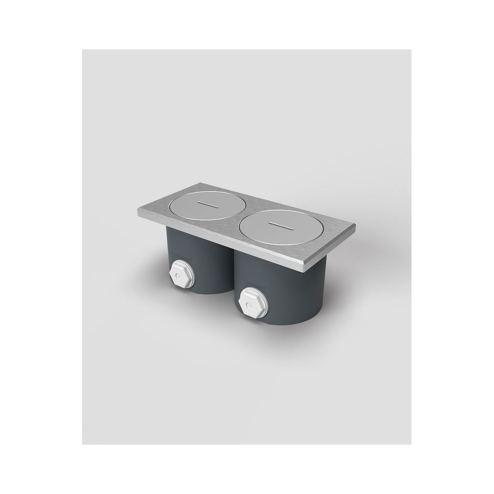 Floor socket outlet 7602A for outdoor use with 2 separate sockets, each of which is closed with a screw cover. The housing of the floor socket is made of solid grey PVC. The rectangular frame is made of solid aluminium, anodised to look like stainless steel. When closed, the floor socket 7602A is watertight. The cover can be removed completely and is lockable with a special key. Further equipment variants on request.