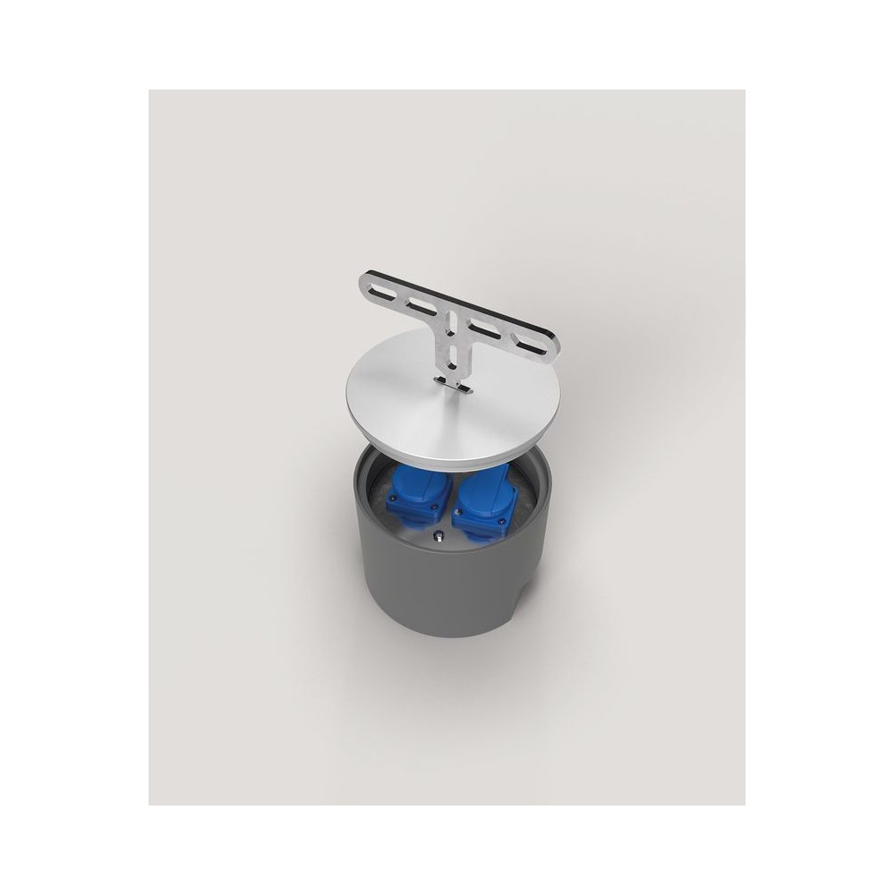 Round floor socket 7702A with aluminium screw cover and 2 slots. The floor socket is made of solid grey PVC and can be used both outdoors and indoors. When closed, it is waterproof. The floor socket is opened and closed with a special key. Further equipment variants are available on request.