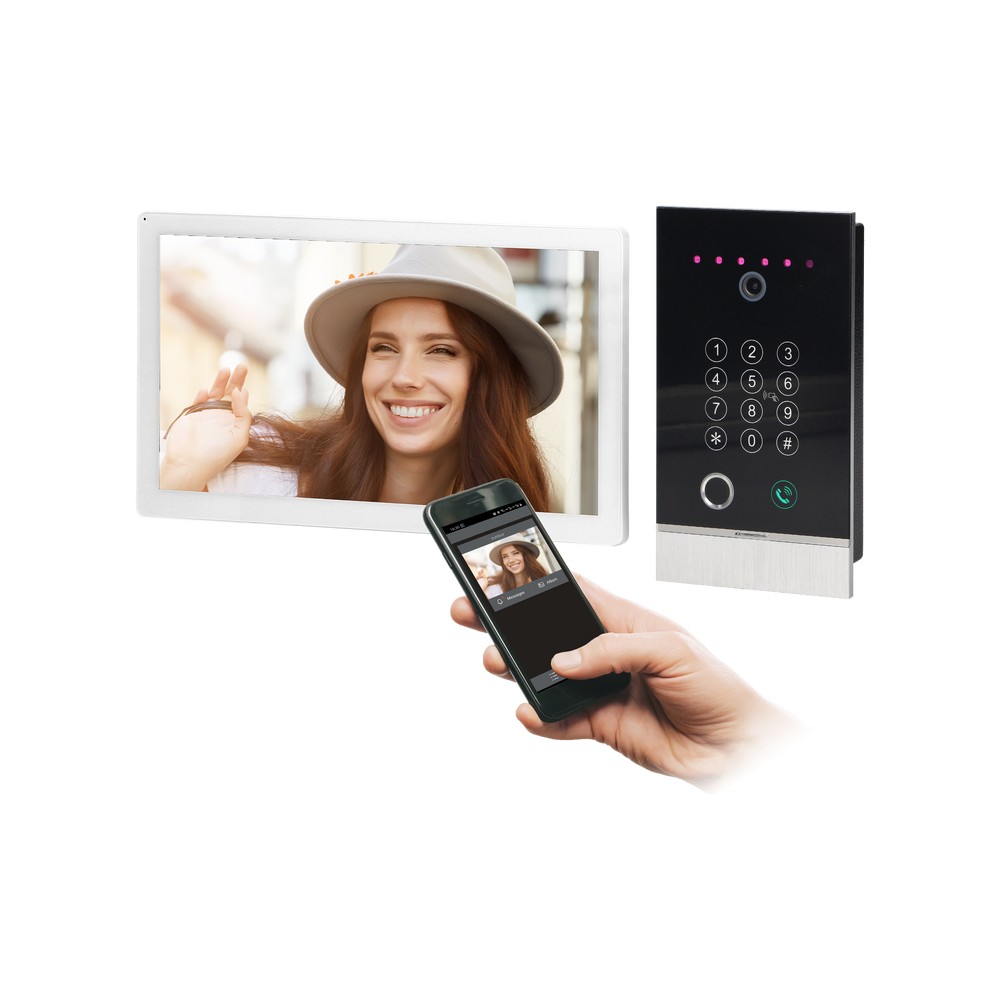 Elegant: modern large LCD monitor with a diagonal of 10 inches in a housing that can be adapted to any interior, and the integrated power supply unit for a top-hat rail makes the cables disappear. The set includes an external flush-mounted cover. Ensure security: motion sensor, preview, record and save video and photo files from the camera to the micro SD card allow us to always know who has visited us. Waterproof: IP65 protection means we don't have to worry about the external panel even in heavy driving rain. SMART function: control via a smartphone or tablet from anywhere thanks to a simple app available for Android and iOS. Gate control: we can easily open it with a fingerprint, proximity card or PIN code on the illuminated keypad of the encryptor.