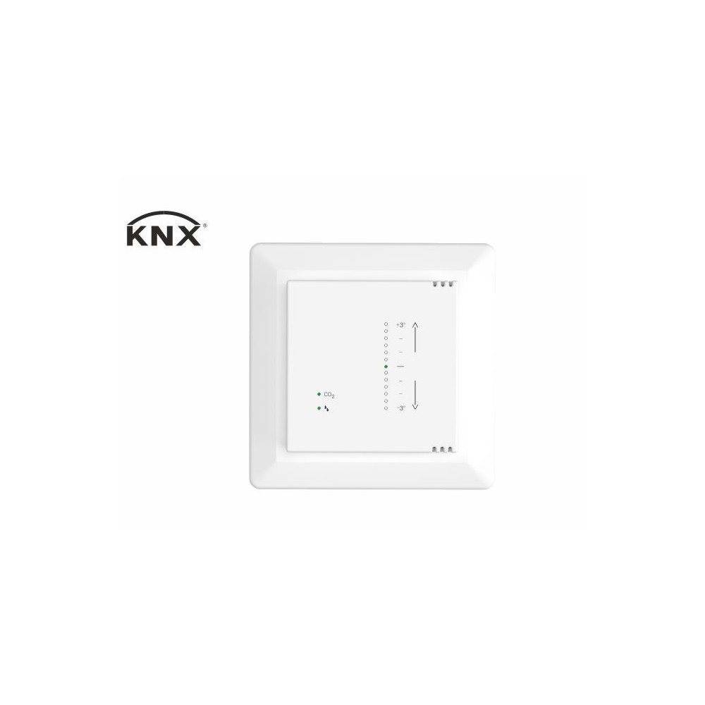KNX air quality sensor and KNX room climate controller with hygrostat, CO2 sensor and temperature control. Optimal for room climate control and monitoring of the room air via KNX. Setpoint temperature can be adjusted step by step by touch. Note: Device box German standard