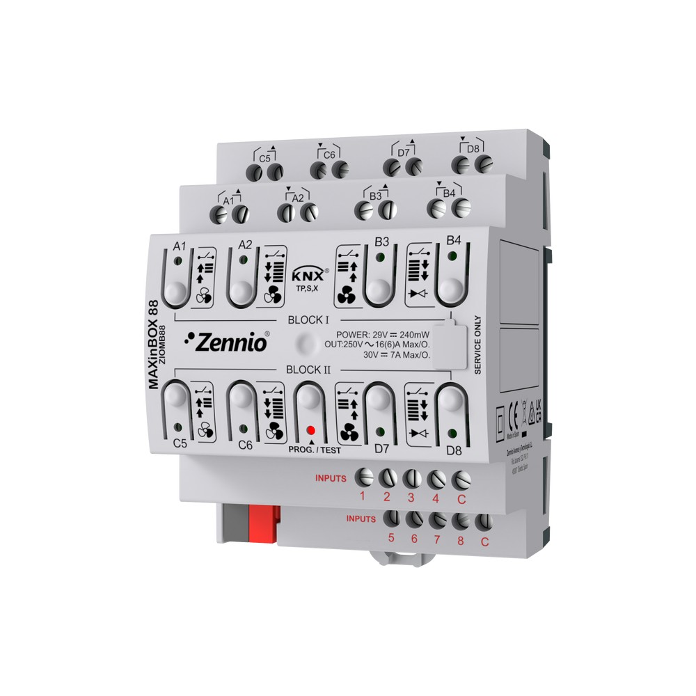 Multifunction sensor-actuator for DIN-rail (4 units) with 8 outputs (16 A C-load) which offer multiple configurations as shutter channels or individual outputs. It allows manual control of its outputs through the push buttons on the cover. It includes 20 independent logical functions. In addition, it incorporates 8 analog/digital inputs that may be configured as binary inputs for sensors and potential free push buttons, as temperature probe inputs or as motion sensor inputs. Four room thermostats to control heating/cooling systems are included. It is compatible with KNX Secure. Accessories: temperature probe and motion sensor.