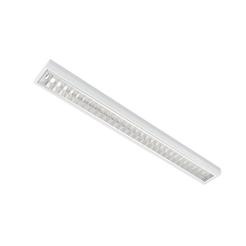 Luminaire housing made of sheet steel with bevelled side edges, powder-coated white. Wired ready for connection with MID-POWER LED (CRI bigger than 80, 80,000 h) and integrated, certified brand driver (ENEC). The opal LED system cover gives the luminaire its homogenous appearance. Louvre made of pure aluminium, double parabolic, high-gloss. Suitable for VDU workstations (UGR smaller than 19).