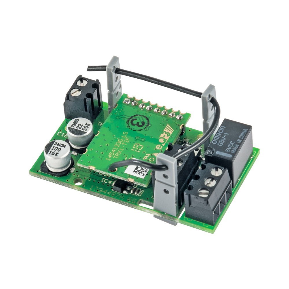 Enables the wireless switching, e.g. of a switch or button input, 12 V signalling device or LEDs, in the extra-low voltage range. Thanks to the compact design the device can be flexibly installed into existing devices and own projects.