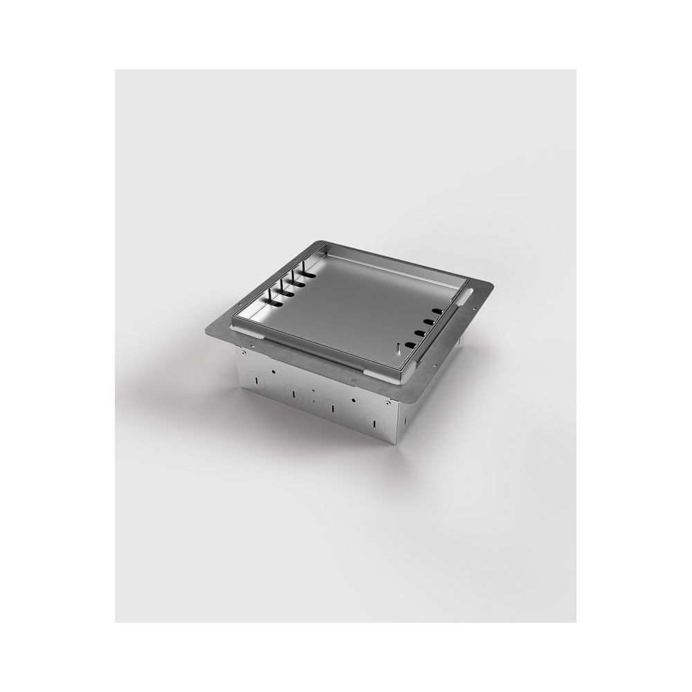 Height-adjustable hollow-bottom tank 8908H 8-fold. The receptacle box is made of sendzimir-galvanised sheet steel. Frame and lid made of stainless steel. The lid closes even with standard plugs inserted in straight or angled form and is also available with a brush outlet. The removable hinged lid can be covered with 15 mm stone, wood, etc.. The underlay frame makes this floor socket ideal for hollow floors! Further equipment variants on request.