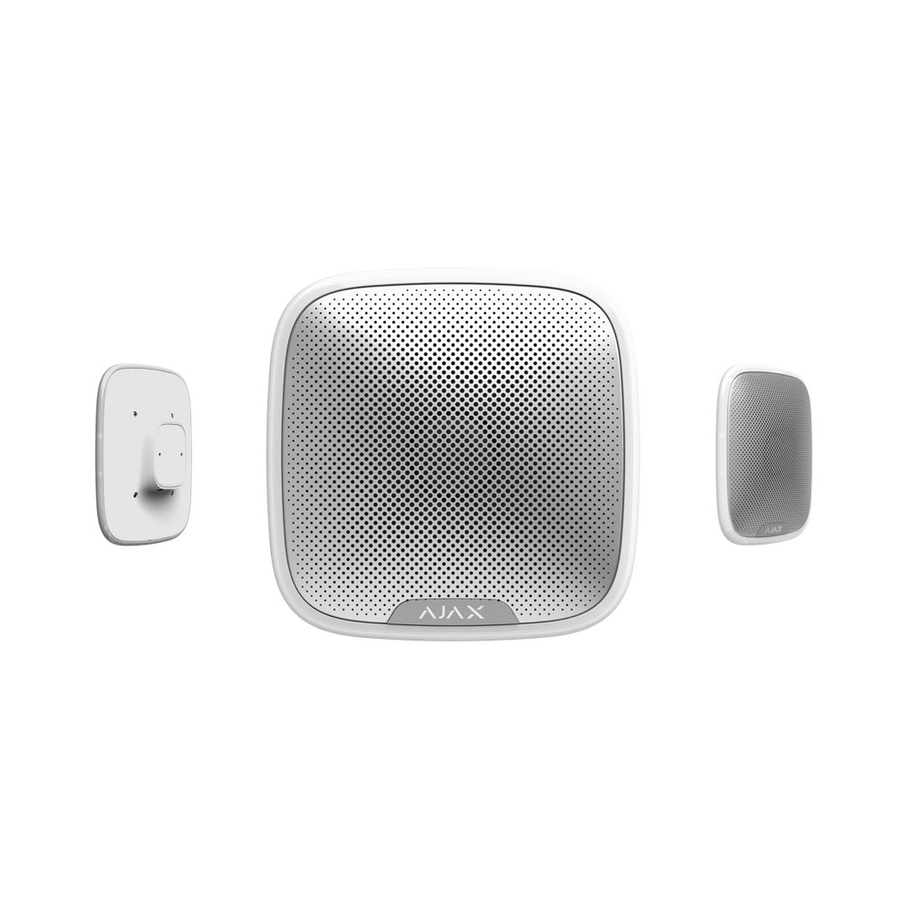 The Ajax StreetSiren is a wireless outside siren of the alarm system. Thanks to sound and light, passers-by are made aware of danger. The device signals the activation of the detector with an acoustic alarm and an LED.