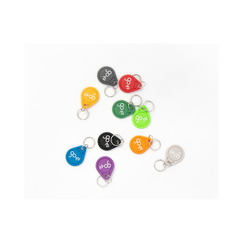 Tags RFID en forme de porte-clés. Les tags RFID permettent d'autoriser et de personnaliser la charge sur un go-e Charger. Il est par exemple possible d'attribuer un compte à chaque tag et de consulter les kWh chargés via ce compte. Notez que pour utiliser ces fonctions, il est nécessaire de configurer le go-eCharger via l'application.