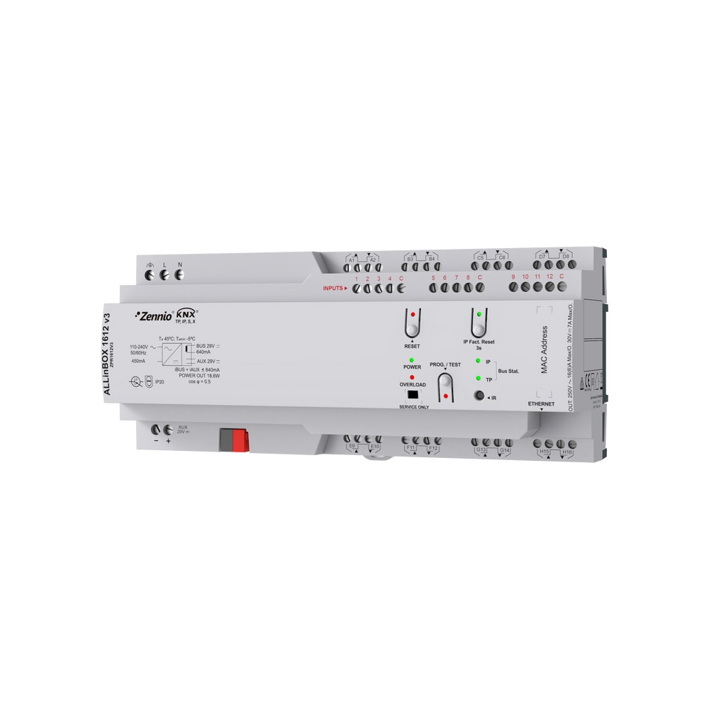 Dispositif multifonction qui intègre tout le nécessaire pour le contrôle et la supervision d’installations, sur seulement 12 unités de rail DIN. Il inclut une alimentation KNX de 640 mA, une Interface KNX-IP, un contrôleur de climatisation avec jusqu’à 4 thermostats de zone, un module de fonctions logiques et un actionneur multifonction de 12 entrées et 16 sorties 16 A C-Load, qui permettent une configuration multiple comme sorties individuelles, canaux de volets ou contrôleur de ventilo-convecteur. Il est compatible avec KNX Secure.