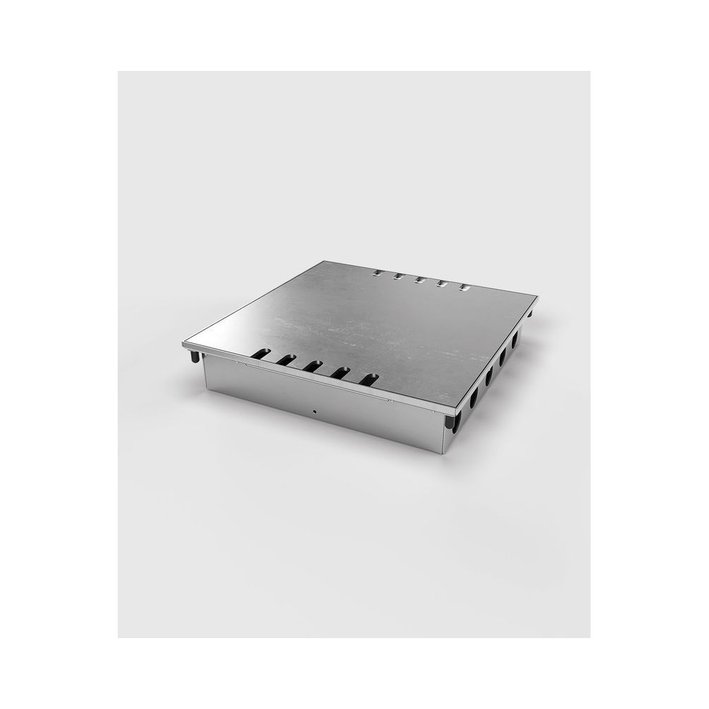 Réservoir au sol 8810B en acier inoxydable poli. À l'intérieur se trouvent deux supports d'appareils en aluminium pour 5 unités chacun. L'installation peut se faire à n'importe quel endroit du sol, car des tuyaux sont utilisés pour l'alimentation en eau. En raison de sa faible hauteur, ce modèle convient particulièrement bien aux sols des bâtiments anciens. Le couvercle sans rebord dispose de sorties de câbles et se ferme même lorsque les fiches sont enfichées. De plus, le couvercle est conçu pour être collé avec des revêtements de sol. Autres variantes d'équipement sur demande.
