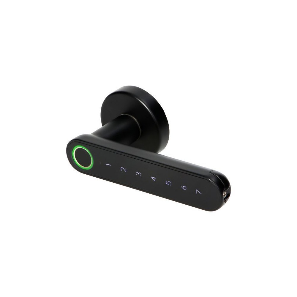Une poignée intelligente avec clavier tactile et lecteur d'empreintes digitales convient aussi bien pour les portes droites que pour les portes gauches, à la place d'une poignée traditionnelle. Elle peut être ouverte en saisissant le code PIN de l'utilisateur, en scannant l'empreinte digitale préalablement saisie ou via la connexion Bluetooth et l'application sur le téléphone. Les vis de fixation fournies permettent de l'installer dans des portes d'une épaisseur de 38 mm à 58 mm, et la forme élégante de la poignée s'adapte à de nombreux types de portes.