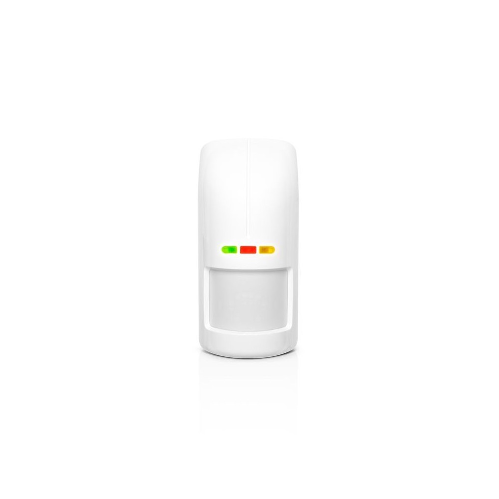 Détecteur de mouvement double sans fil PIR+MW, (IP 54), immunité aux animaux domestiques (jusqu'à 20 kg), protection anti-reptation et anti-sabotage, capteur de température et de crépuscule intégré
