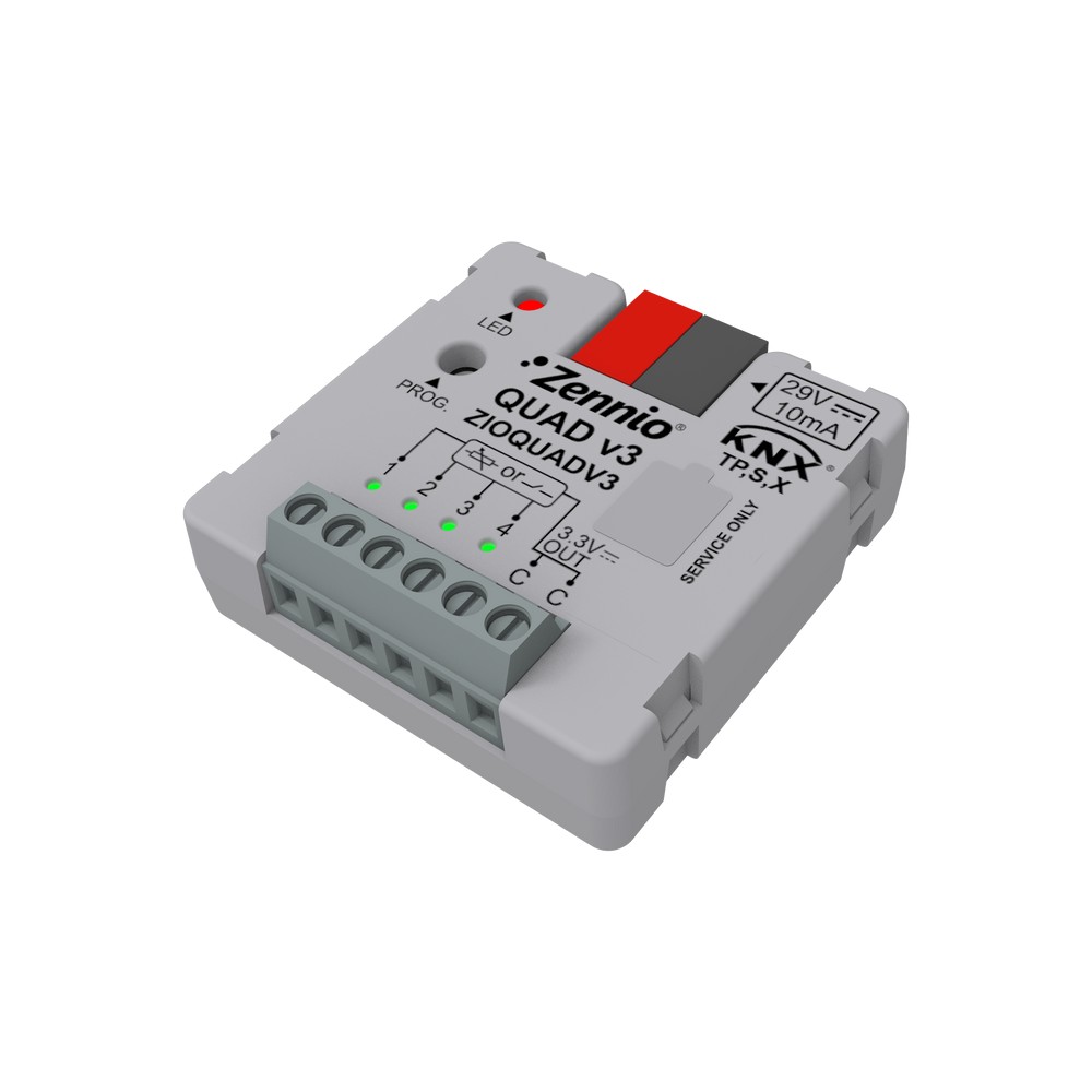 Capteur analogique / numérique. QUAD v3 est un capteur analogique – numérique qui offre une multitude de fonctionnalités. Il dispose de 4 entrées pouvant être configurées comme entrées binaires multifonction opto-couplées pour capteurs et interrupteurs libre de potentiel, comme sonde de température avec thermostat de zone pour le contrôle des circuits de froid/chaud, et comme entrée de détection de mouvement. Il est compatible avec KNX Secure. Accessoires : Sondes de température et détecteur de mouvement.