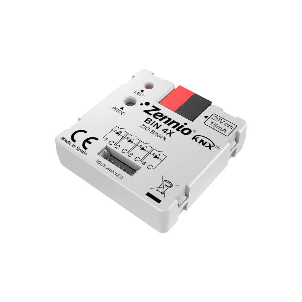 BIN 4X. Interface universelle avec 4 entrées binaires/sorties LED. Le BIN 4X est un module avec 4 canaux configurables comme entrées binaires ou sorties LED. Les entrées binaires peuvent être configurées comme capteurs, interrupteurs ou boutons poussoirs libres de potentiel. Les sorties binaires peuvent être utilisées pour des indicateurs LED à courant faible. Installation en boîtier encastrable standard.