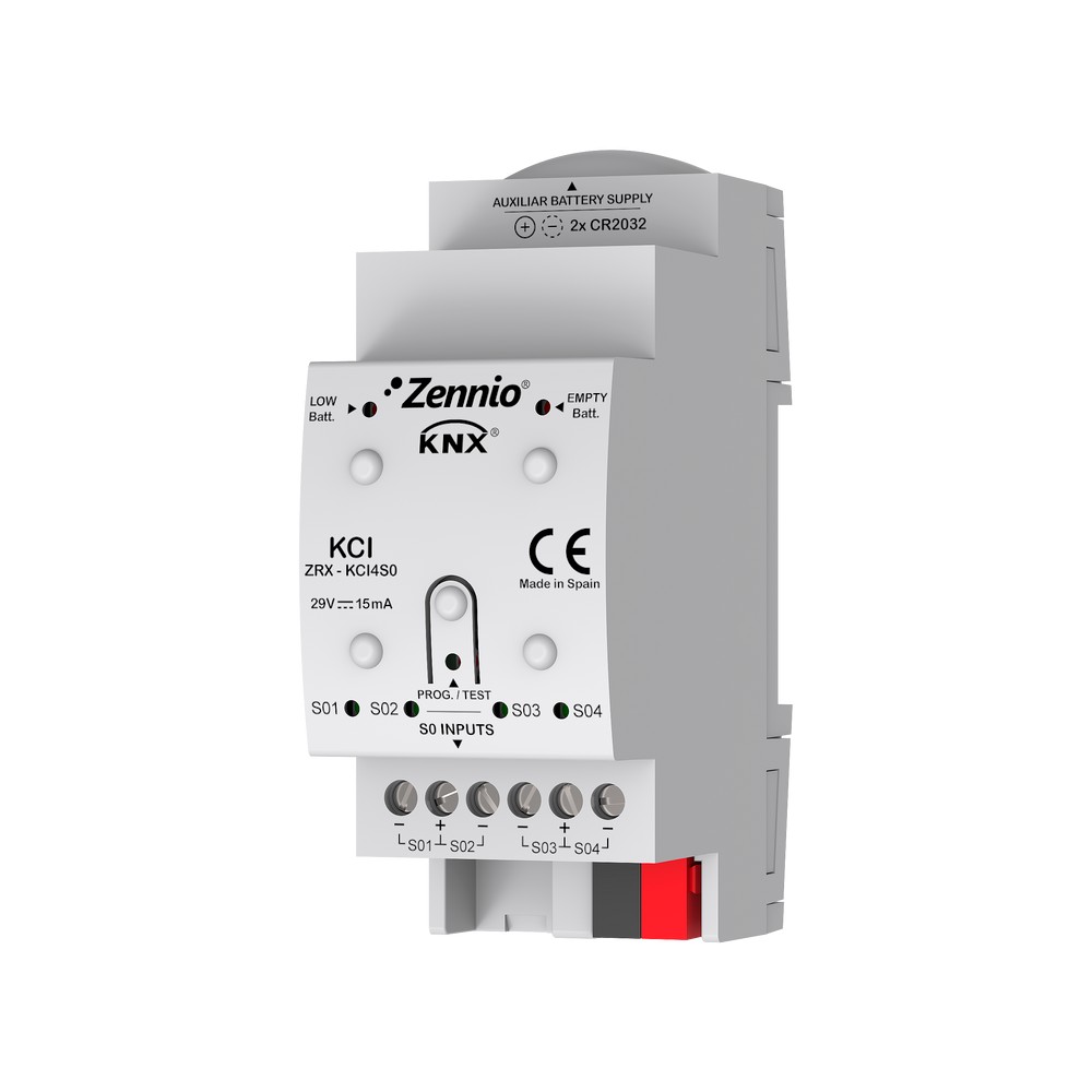 KCI. Interface KNX pour compteurs de consommation. Le KCI est l'interface KNX de Zennio pour quatre compteurs de consommation avec émission d'impulsions S0. Il permet de superviser sur le bus KNX la consommation d'électricité (énergie et puissance), d'eau et/ou de gaz (volume et débit). Il contient une batterie extractible qui permet de garder les impulsions S0 en cas de panne électrique et de récupérer la consommation réelle plus tard. Il inclut des Indicateurs LED pour vérifier l'existence de communication au travers de chaque canal S0, ainsi que l'état de la batterie (batterie faible et/ou batterie épuisée), états qui sont indiqués aussi sur le bus KNX. Dispositif facile à monter sur rail DIN (2 unités rail DIN).