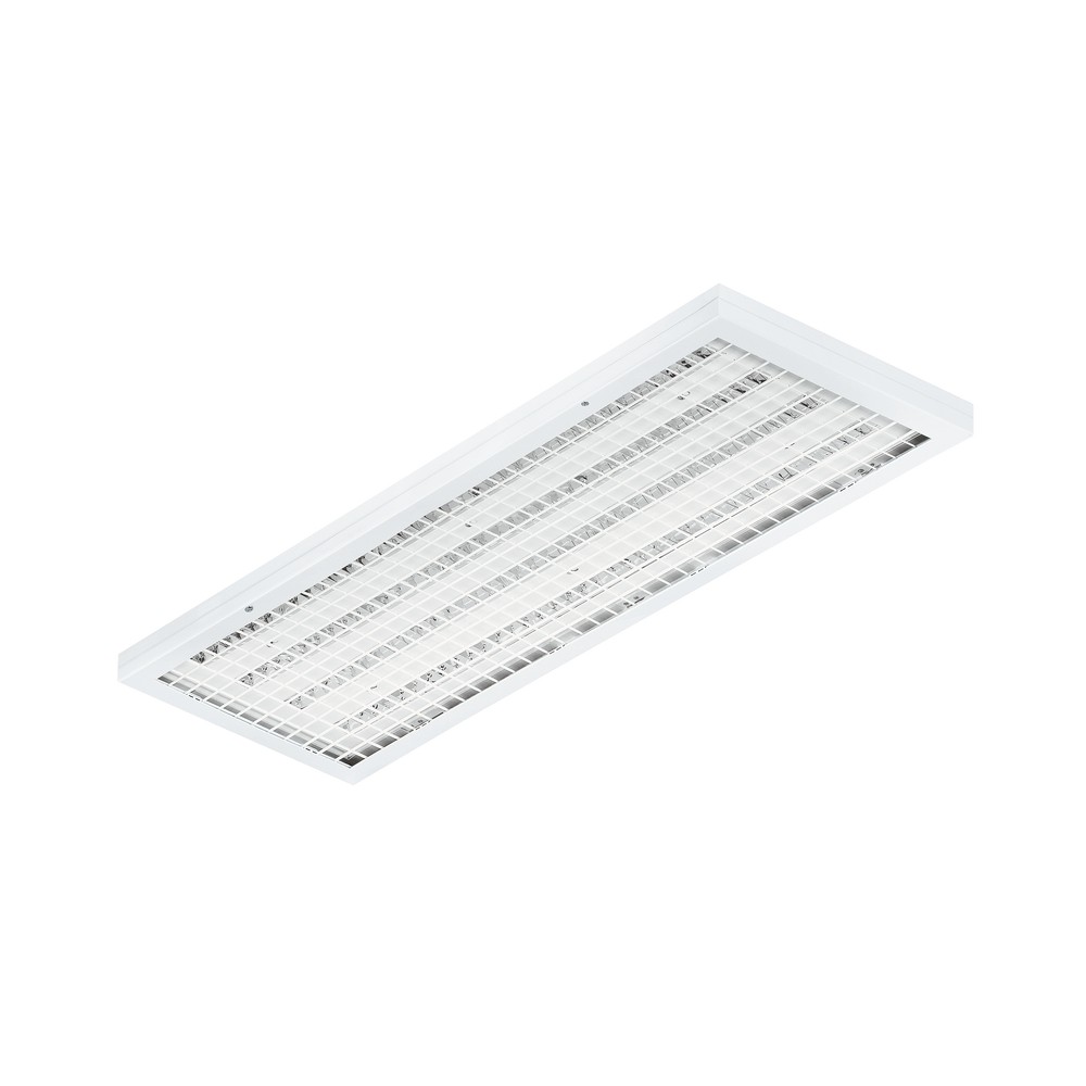 oîtier plat et intemporel en tôle d'acier, peint par poudrage en blanc. Le luminaire est câblé prêt à être raccordé avec un driver de marque certifié AC / DC et un système LED de haute qualité (CRI plus que 80, 50.000 h). Le contrôle de l'éblouissement du luminaire est optimisé au moyen d'une grille parabolique en aluminium haute brillance, ce qui garantit une répartition directe de la lumière à faisceau large. En plus de ce système de réflecteur, le luminaire dispose également d'un disque prismatique MIKRO intégré affleurant dans le boîtier, qui homogénéise la répartition lumineuse dans le plan d'usinage. Pour protéger le système de réflecteur et le disque prismatique MIKRO, le luminaire est également équipé d'un cadre robuste en tôle d'acier avec grille de protection intégrée. Le luminaire obtient ainsi une résistance totale aux chocs de IK 10 et une certification selon DIN 18032-3:1997-04 et DIN EN 13964:2014-8 pour la projection de billes.