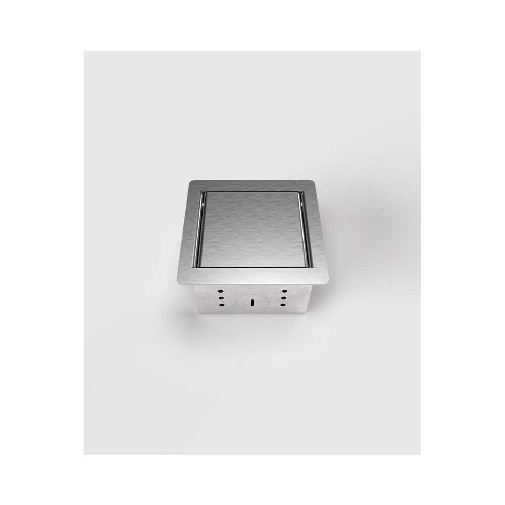 Prise de sol 3301E en acier inoxydable de 1,5 mm, polie, avec couvercle rabattable. Pour le montage, le support d'appareils peut être retiré par l'avant. Deux trous sont prévus à gauche et à droite pour la fixation. Particulièrement bien adapté aux faibles profondeurs de montage, comme par exemple dans les salons, les cuisines, etc. Autres variantes d'équipement sur demande. Le cadre et le couvercle sont en acier inoxydable de 1,5 mm (1.4301) et la boîte de réception en tôle d'acier galvanisée sendzimir.