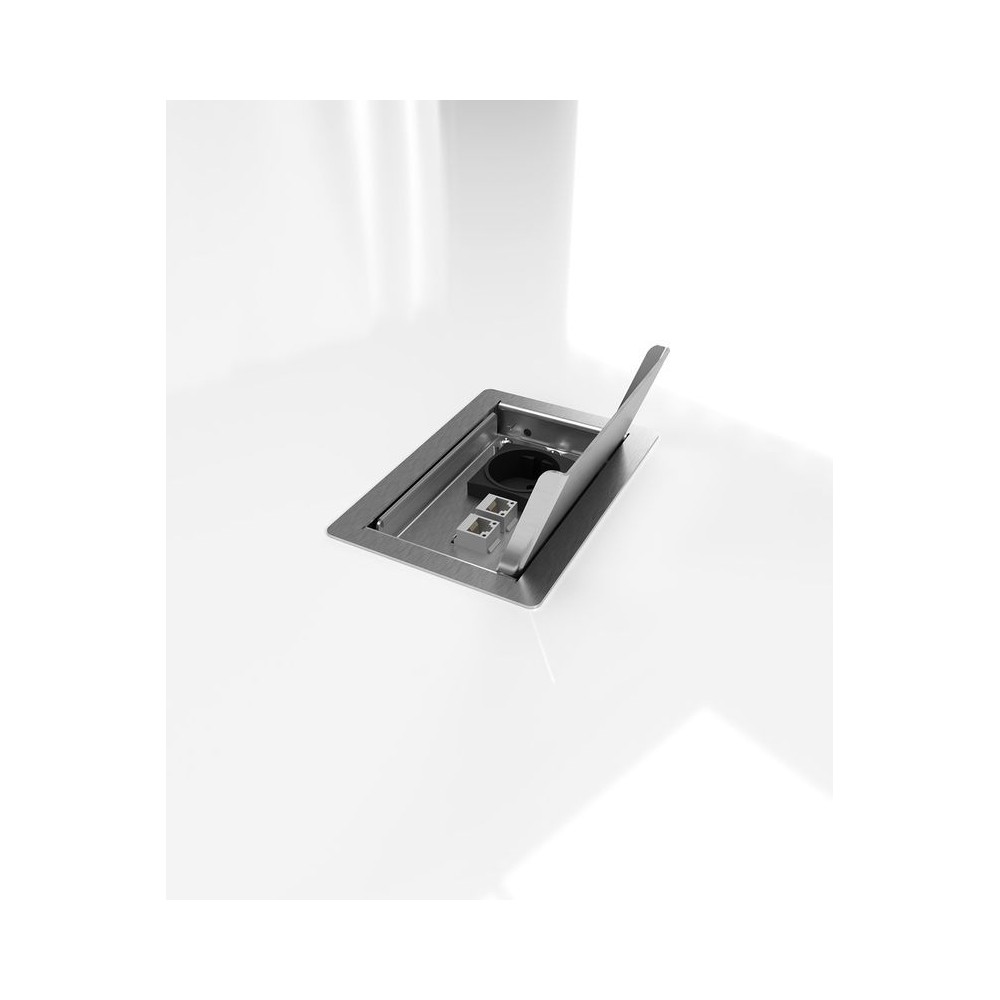 Prise de sol 3302E en acier inoxydable de 1,5 mm, polie, avec couvercle rabattable. Pour le montage, le support d'appareils peut être retiré par l'avant. Deux trous de fixation sont prévus à gauche et à droite. Particulièrement bien adapté aux faibles profondeurs de montage, comme par exemple dans les salons, les cuisines, etc. Autres variantes d'équipement sur demande. Le cadre et le couvercle sont en acier inoxydable de 1,5 mm (1.4301) et la boîte de réception en tôle d'acier galvanisée sendzimir.