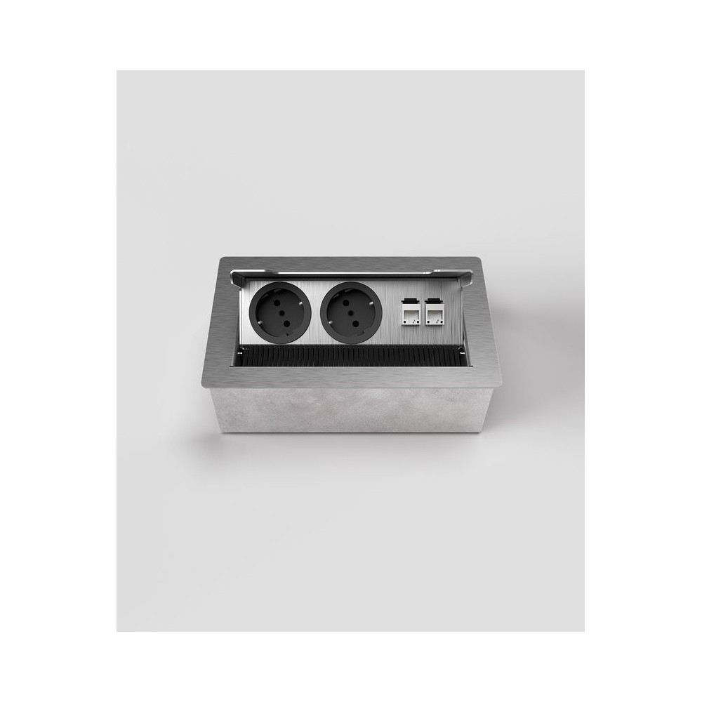 Prise de table 3203E avec module de raccordement en acier inoxydable de 1,5 mm, poli, avec couvercle rabattable. Le couvercle rabattable se ferme même lorsque les fiches sont enfichées. Le support d'appareils peut être retiré pour le montage. Avec une charge de surface de 120 kg, la prise de table 3202E peut également être utilisée comme prise de sol. Elle convient particulièrement aux plans de travail, aux sols creux, aux zones d'exposition, etc. Autres variantes d'équipement sur demande.